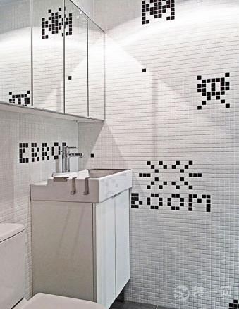 卫生间,简洁的黑白色调,洗手台、马桶一概全白,而唯独在瓷砖的设计上做了功夫,又点睛之笔的效果,个性十足。